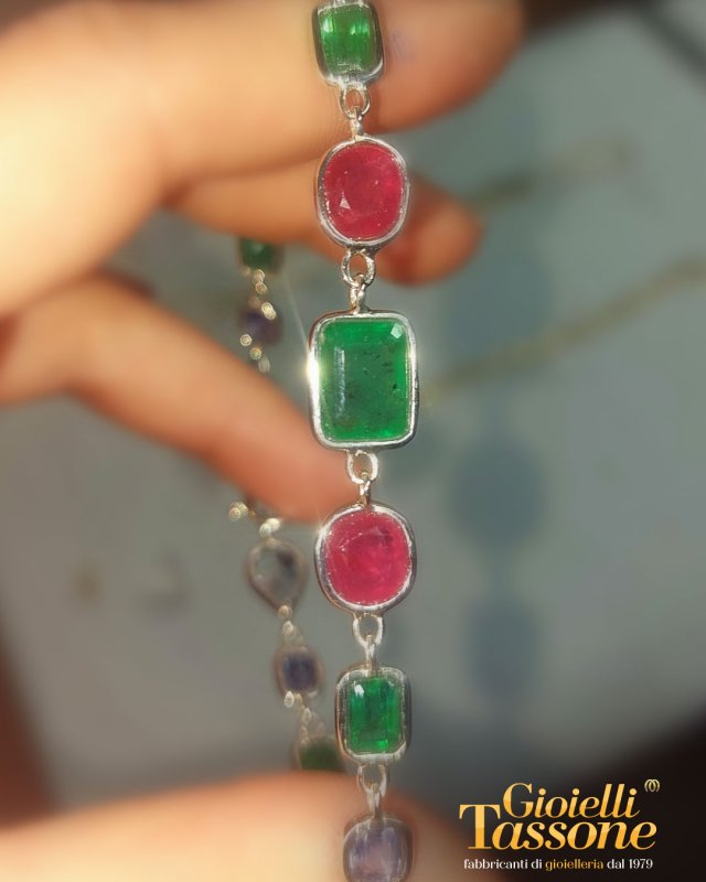Questo non è un gioiello qualunque, ma il frutto della passione di un cliente straordinario che, negli anni, ha ricercato e collezionato gemme preziose dall'anima vibrante: rubini ardenti, tanzaniti dal blu profondo, acquemarine serene e smeraldi rigogliosi.