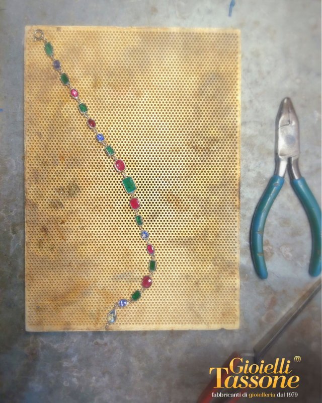 Poi, come in un racconto che si avvia alla sua conclusione, giunge il momento magico del montaggio del braccialetto. Con i castoni pronti, ogni pietra viene delicatamente posizionata al suo posto, creando un'armonia di forme e colori che prende vita sotto i nostri occhi. Questo processo esige pazienza e precisione, perché ogni gemma deve essere allineata e fissata con maestria, garantendo non solo la bellezza del gioiello, ma anche la sua funzionalità e resistenza nel tempo.